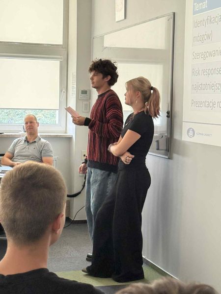 Omówiono m.in. prawdopodobieństwo wystąpienia ryzyk, ich wpływ na realizację projektu oraz sposoby ich minimalizacji. Praca zespołowa uczniów z różnych klas, wspólna analiza i publiczne prezentacje okazały się niezwykle cennym doświadczeniem – zarówno edukacyjnym, jak i integracyjnym. ![]()